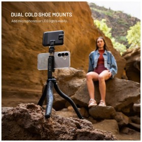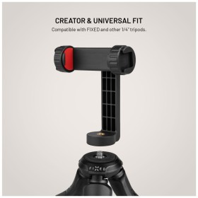 Držiak s 1/4" závitom a nastaviteľnými kliešťami bezpečne pojme telefóny do veľkosti uhlopriečky až 6,9". Vnútorné polstrovanie chránený vložené zariadenie pred poškriabaním. Otočný kĺb držiaka zároveň umožňuje fotenie, natáčanie, alebo streamovanie v horizontálnej aj vertikálnej polohe. Držiak je doplnený o cold shoe adaptéry pre pohodlné pripojenie mikrofónu, LED svetla či ďalších doplnkov. Pre ľahké uchytenie na ľubovoľný kompatibilný statív je vybavený univerzálnym 1/4" závitom.