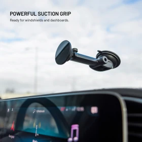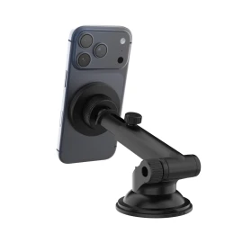 Vďaka silným neodymovým magnetom drží telefón pevne na mieste aj pri jazde po nerovnostiach. Ľahko ho prichytíte stačí priložiť a vyraziť. Ovládanie jednou rukou zaisťuje maximálne pohodlie pri riadení. Držiak sa upevňuje pomocou silnej prísavky na palubnú dosku, alebo čelné sklo , ktorá zaisťuje stabilné uchytenie bez vibrácií. Teleskopické rameno je možné vysunúť až do dĺžky 17,5 cm. Otočný kĺb umožňuje nastaviť ideálny pozorovací uhol pre navigáciu aj handsfree hovory. Predná plocha z temperovaného skla dodáva držiaku prémiový vzhľad a zároveň zaisťuje hladký kontakt s telefónom. Dizajn je vyvinutý v Českej republike.