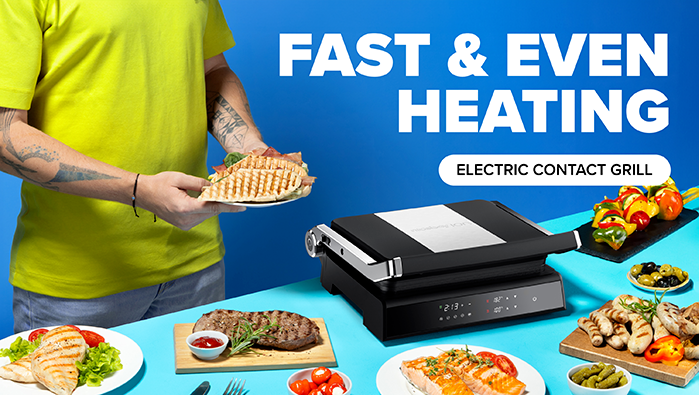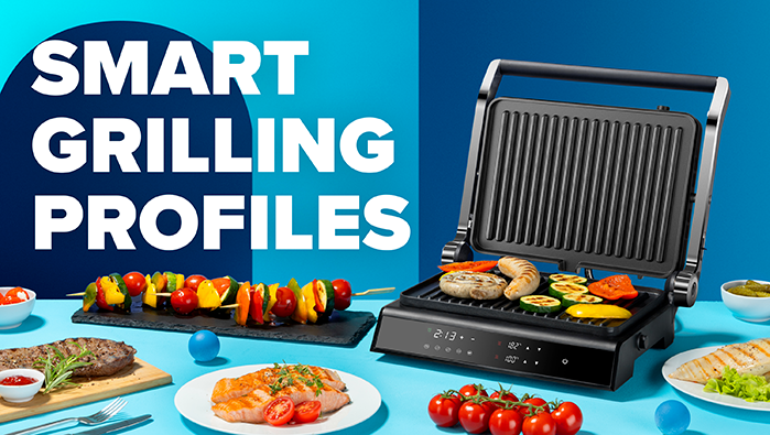 Moderný kontaktný gril, ktorý vďaka piatim prednastaveným profilom a nepriľnavým doskám umožňuje pohodlné a zdravé grilovanie s minimom oleja.