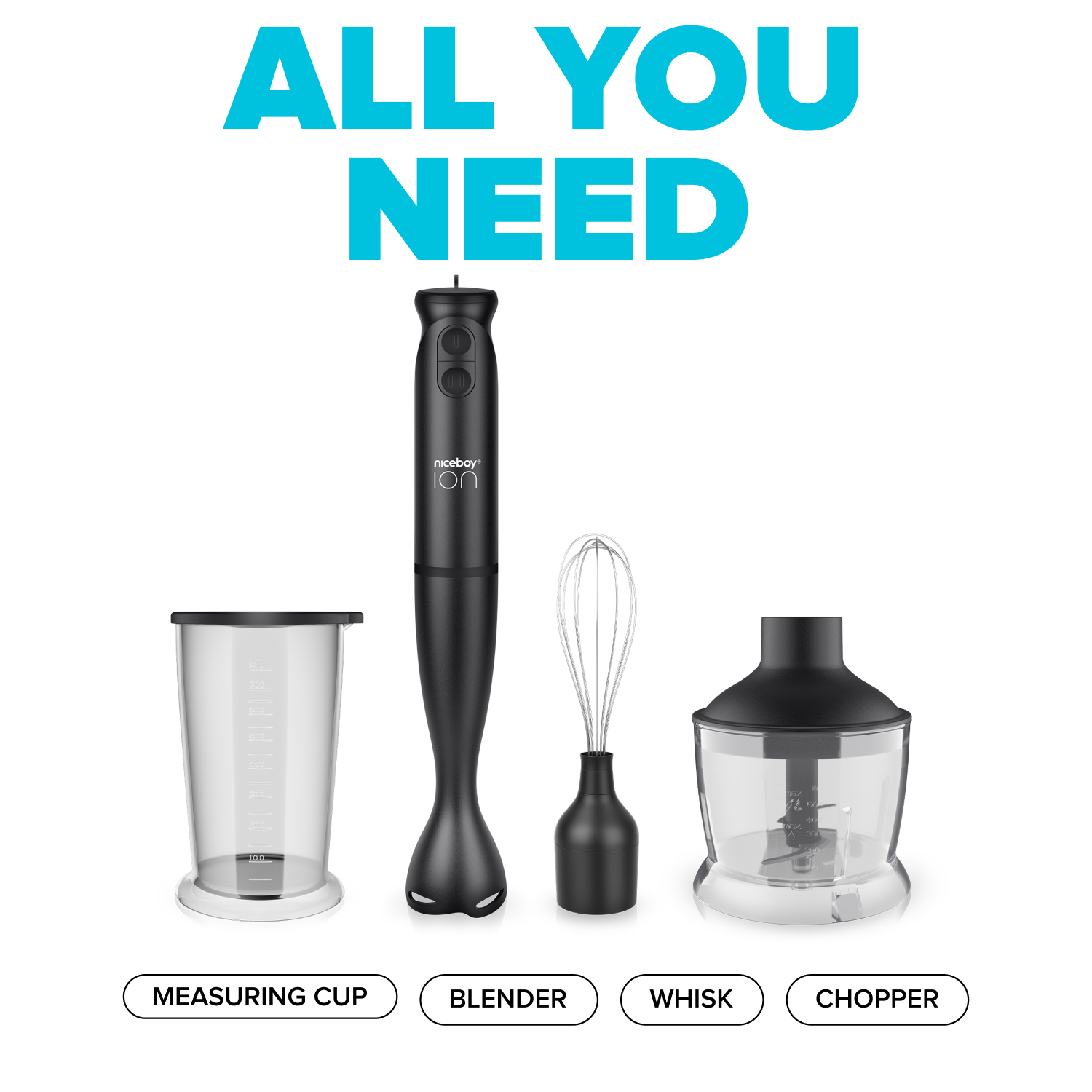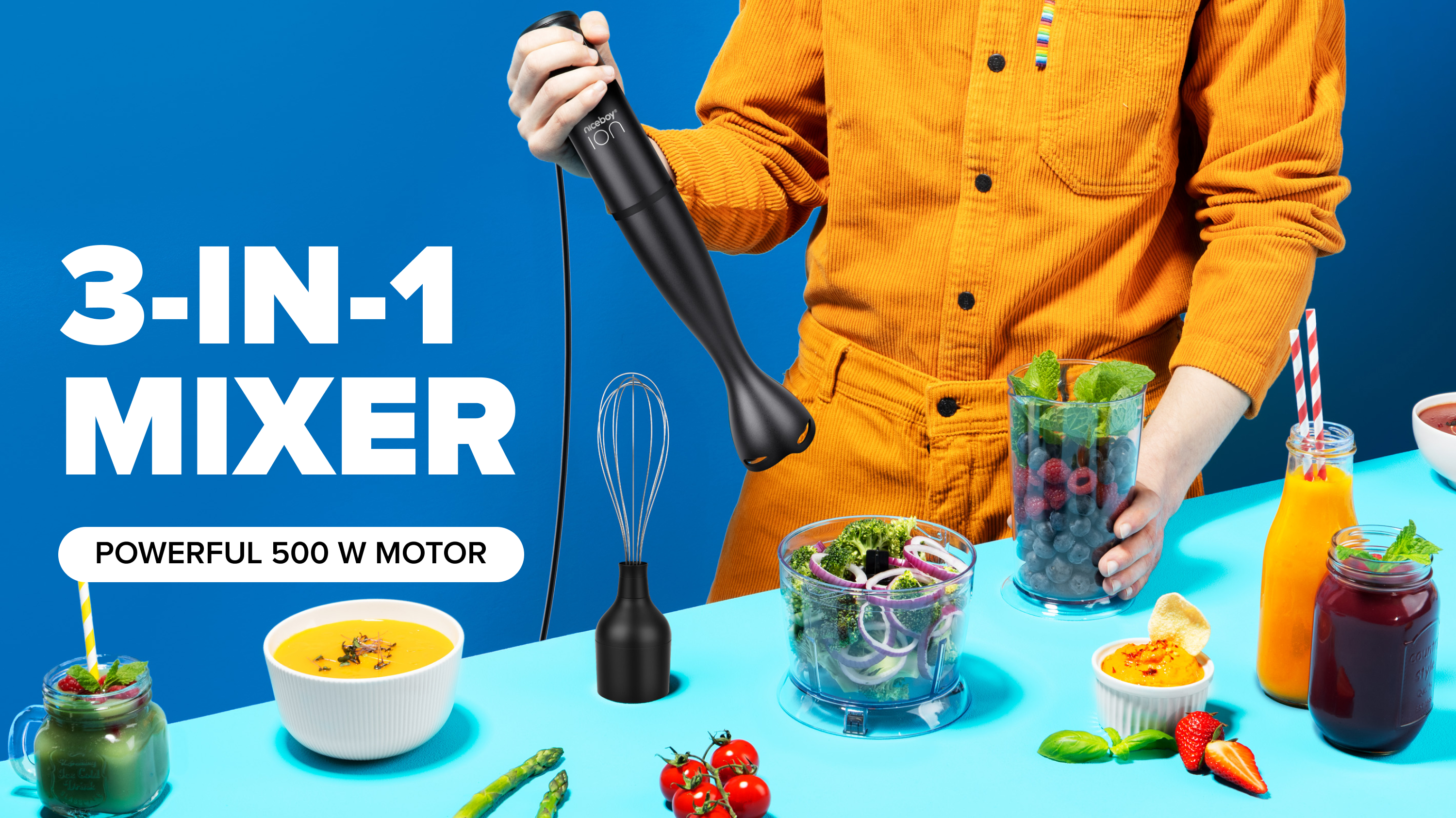 Mixér, sekáčik a šľahač naraz v jednom silnom pomocníkovi. Niceboy Twister T1 Set s 500-wattovým motorom ti v kuchyni pripraví smoothie, domáce pesto, šľahačku na tortu aj orechové maslo. Má dva rýchlostné režimy, tri nástavce a 600 mililitrovú odmerku. Tento štýlový parťák sa zmestí všade - aj do mini kuchynky v podnájme.