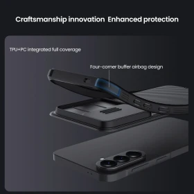 Zadný kryt Nillkin CamShield PRO pre Samsung Galaxy A57 . Mimoriadne odolné puzdro , ktoré ponúka perfektnú ochranu vášho zariadenia pred možným poškodením. Skvelým prvkom je posuvný jazdec , ktorý podľa potreby úplne zakryje zadnú kameru a ochráni ju pred prípadným fyzickým poškodením alebo zaprášením. Celý mechanizmus púzdra funguje spoľahlivo a kombinuje klasické, módne a ochranné prvky.