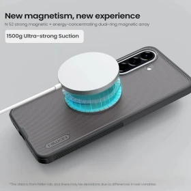 Ochranný kryt Nillkin Super Frosted PRO Magnetic. Obal je oproti klasickému Super Frosted vyrobený z dvoch materiálov a vybavený magnetom dokonale absorbuje otrasy a chráni mobilný telefón Samsung Galaxy A57 aj pred povrchovým poškodením. Povrch je matne textúrovaný a zabraňuje vykĺznutiu z ruky.