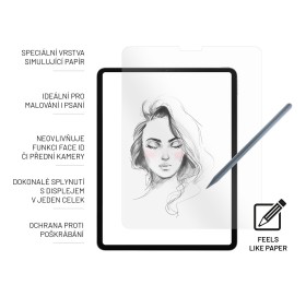 Špeciálny povrch skla poskytuje presnú odozvu displeja a písanie stylusom bude rovnako prirodzené a isté ako na klasickom papieri. Sklo fajnovo priľne k celej ploche displeja vrátane zaoblených okrajov. Dobrá vlastnosť FIXED PaperGlass Screen Protector je, že nijako neovplyvňuje selfie kameru, alebo odomykanie pomocou Face ID. Nepríjemným odrazom svetla na displeji tabletu zabráni matné antireflexné prevedenie. Dokonalé parametre PaperGlass Screen Protector ocenia kresliari, grafici aj užívatelia píšuci často poznámky, vaša práca bude na iPade rovnako perfektná ako na klasickom papierovom notese. Sklo je kompatibilné so všetkými bežnými puzdrami a klávesnicami pre iPad. Balenie obsahuje všetko potrebné pre jednoduchú a rýchlu inštaláciu.