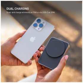Powerbanka FIXED MagZen 5 Stand s kapacitou 5 000 mAh zajistí rychlé doplnění energie vašim zařízením, ať už jste kdekoliv. Díky integrovaným MagSafe magnetům ji snadno přichytíte na zadní stranu iPhone 12 a novějších modelů nebo jakéhokoliv telefonu opatřeného MagSafe krytem. Po přichycení se automaticky spustí nabíjení výkonem až 15W (7,5W pro iOS). Pokud váš telefon MagSafe nepodporuje, můžete nabíjecí plochu využít jako bezdrátovou nabíjecí podložku. Kromě bezdrátového nabíjení nabízí také rychlé kabelové nabíjení přes USB-C port s výkonem až 20W. Součástí je také integrovaná výklopná nabíječka pro hodinky Apple Watch, takže lze nabíjet až tři zařízení zároveň. Kapacita powerbanky 5 000 mAh je dostatečná pro průběžné dobíjení během celého dne, samotnou powerbanku dobijete prostřednictvím USB-C konektoru výkonem až 18W. Díky vyvýšené MagSafe ploše drží telefon pevně na místě – ať už ve vertikální, nebo horizontální poloze. Praktický kovový stojánek zajistí pohodlný náklon telefonu během nabíjení, ideální pro sledování videí, video hovory nebo práci. A pokud powerbanku připojíte k nabíječce, získáte z ní plnohodnotnou nabíjecí stanici pro všechna svá zařízení – ideální řešení na pracovní stůl nebo noční stolek.