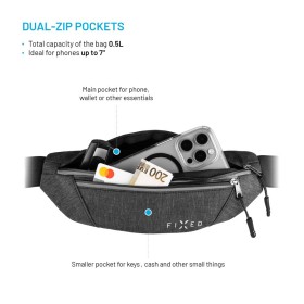 So športovou ľadvinkou FIXED Sportbelt máte všetko dôležité vždy po ruke. Dve vrecká s celkovým objemom 0,5 litra pohodlne pojmú všetky nevyhnutnosti. Hlavné vrecko poskytuje dostatok priestoru pre telefón s uhlopriečkou až 7", peňaženku alebo slúchadlá.