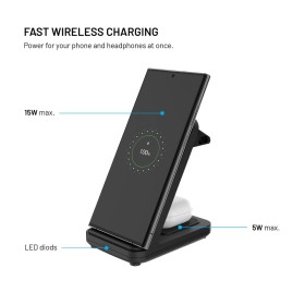 Hlavná nabíjacia plocha stojanu poskytuje výkon až 15 W a podporuje rýchle bezdrôtové nabíjanie všetkých kompatibilných telefónov. Vďaka dvojitej nabíjacej cievke môžete telefón pohodlne umiestniť ako na výšku , tak na šírku , a pritom ho nerušene používať napríklad na sledovanie videí. Druhá plocha s výkonom až 5 W je určená pre bezdrôtové slúchadlá alebo iné drobné príslušenstvo, ktoré podporuje Qi nabíjanie.