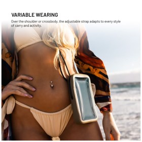 Uzavretie zaisťuje vodeodolný zips, ktorý stačí pevne dotiahnete a puzdro sa okamžite utesní. Vďaka certifikácii IPX8 ochráni váš obsah aj pri ponorení do hĺbky až 5 metrov po dobu jednej hodiny. Pre pohodlné nosenie je puzdro vybavené nastaviteľným popruhom s dĺžkou až 145 cm.