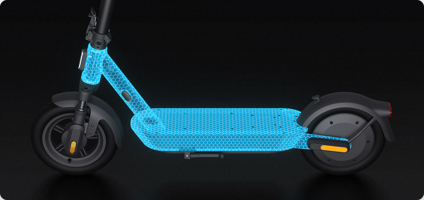 Konštrukcia z vystuženej uhlíkovej ocele je navrhnutá tak, aby odolala aj vyššiemu zaťaženiu. Vďaka širšej platforme a vyšším riadidlám poskytuje pohodlie aj jazdcom s vyššou postavou. Robustný rám unesie až 120 kg a zaručuje pocit istoty aj pri rýchlej jazde.