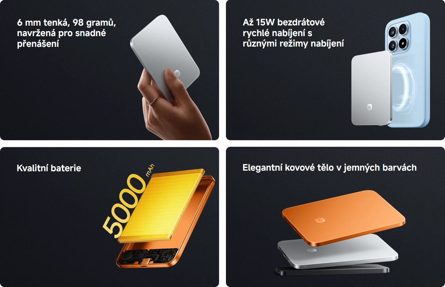 Ultratenká magnetická powerbanka Xiaomi 5000 mAh s rychlým bezdrátovým i kabelovým nabíjením je ideálním řešením pro každodenní doplnění energie bez zbytečné zátěže.