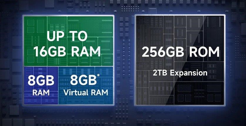 O plynulý chod sa stará 8GB RAM , ktorú je možné rozšíriť až o ďalších 8 GB virtuálnej pamäte. Uložisko činí 256 GB , a pokiaľ by to nestačilo, je možné ho doplniť o TF kartu až do kapacity 2 TB . To všetko beží na modernom Androide 14 , ktorý prináša rýchlejšie animácie, inteligentnú správu aplikácií a vyššiu úroveň zabezpečenia dát.